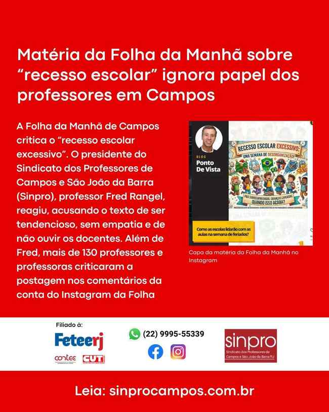A respeito desse “lapso”, o presidente do Sindicato dos Professores de Campos e São João da Barra, professor Frederico Rangel, escreveu um comentário na postagem da Folha no Instagram, que copiamos a seguir: