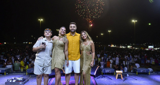 O casal Carlos Alberto e Silvani Pereira mantém a tradição de passar a virada do ano no Farol há mais de 40 anos. Acompanhados dos filhos e de irmãos, eles elogiaram a estrutura do evento e destacaram a preferência pelas músicas do artista Tiee. “A gente vem para o farol todo ano, já faz mais de 40 anos. A estrutura está muito boa e a gente gosta muito das músicas do Tiee. É uma tradição da nossa família estar aqui com nossos filhos e nossos irmãos para celebrar”.