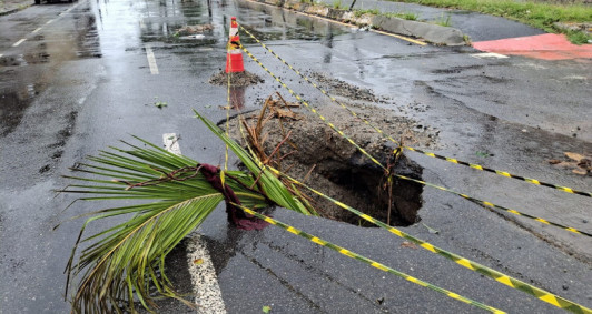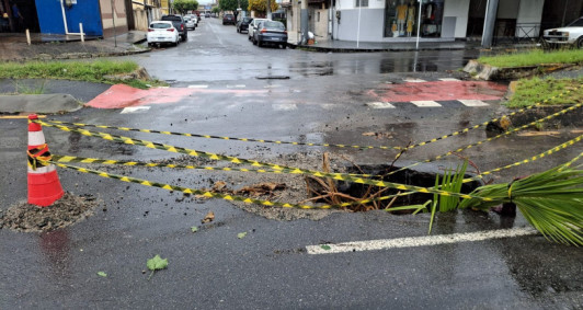 Uma cratera se formou na Rua Doutor Felipe Uebe e gerou reclamações na manhã desta segunda-feira (5). Um cone e faixas estão no entorno para isolar o local. Já no interior do buraco, foram colocados objetos para sinalizar o perigo e evitar danos. A situação acontece após grande período de chuva na cidade e em todo o estado, que segue com previsão para os próximos dias.