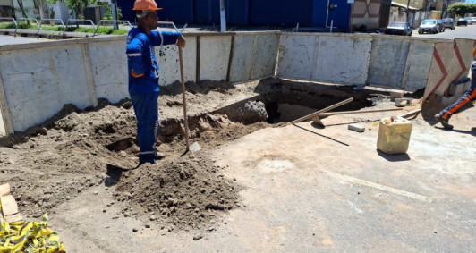 As equipes da prefeitura seguem os trabalhos para tapar a cratera na Rua Doutor Felipe Uebe, em Campos. A problemática gerou reclamações nesta semana, quando moradores informaram que tiveram que ajudar a retirar carros que caíram no buraco. No local, houve interdição total e parcial veículos.